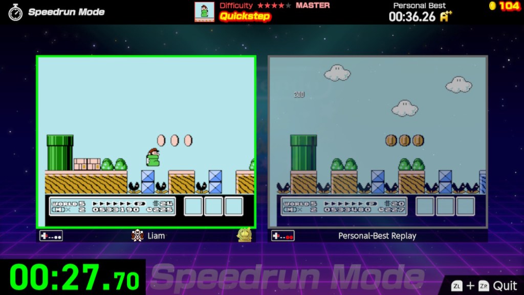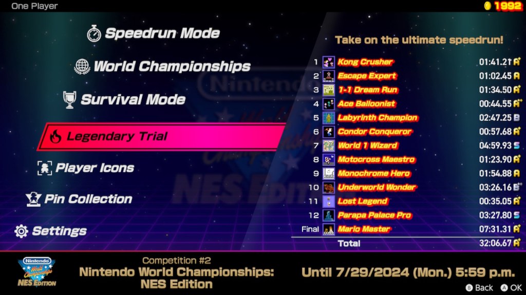 Initially hidden from the menu, there’s actually an unlockable final mode called Legendary Trial, which presents you with all of the game’s 13 Legend difficulty levels, back to back. Even a great performance takes close to half an hour, as it includes a full playthrough of both Donkey Kong and Super Mario Bros., so it’s no joke to practice for an S rank on this one! Thankfully, you also get individual rankings for each of the levels along the way, so you’ll have a good idea where you’re slouching.