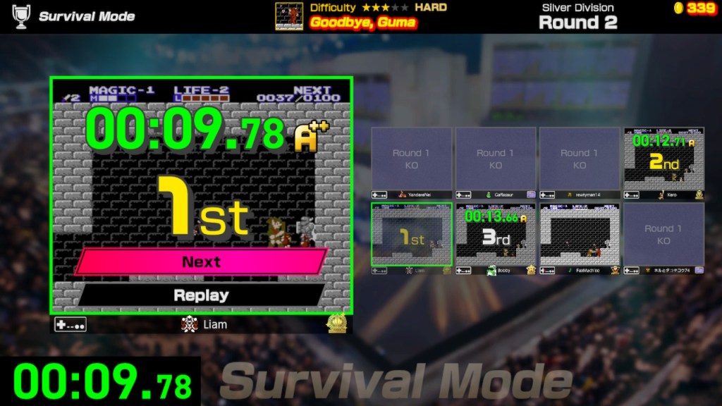 Next up is Survival Mode, where you play a set of three of the weekly World Championship minigames, randomly organized back-to-back against replays from seven other players. Half are eliminated after each round, making for some tense finales.