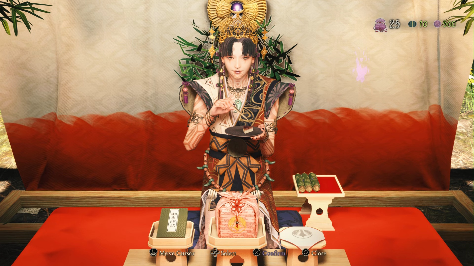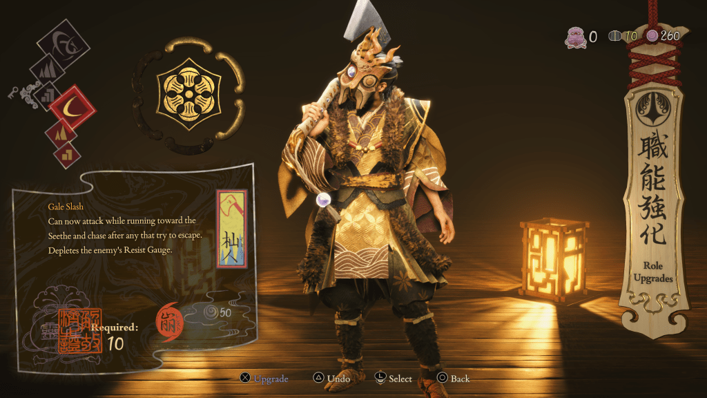 The other main gameplay section is the village gameplay. Between missions, you can return to any of the villages you’ve saved and help the villagers reconstruct by delegating tasks. You can also visit Yoshiro in her tent, where you can choose from a huge array of unlockable gear, upgrade the various villager classes (and Soh, once you’ve progressed far enough)—and even serve Yoshiro beautifully rendered traditional Japanese desserts as the village’s hierarchy of needs are progressively met. Rewards for rebuilding the village are plenty and powerful, with unique equipment, new desserts for Yoshiro, permanent upgrade materials, art, and vital currency cap increases on offer. There’s a powerful sense of tranquility to these village segments, contrasting the chaos of the action levels, and it helps complete the game’s immaculate vibe.