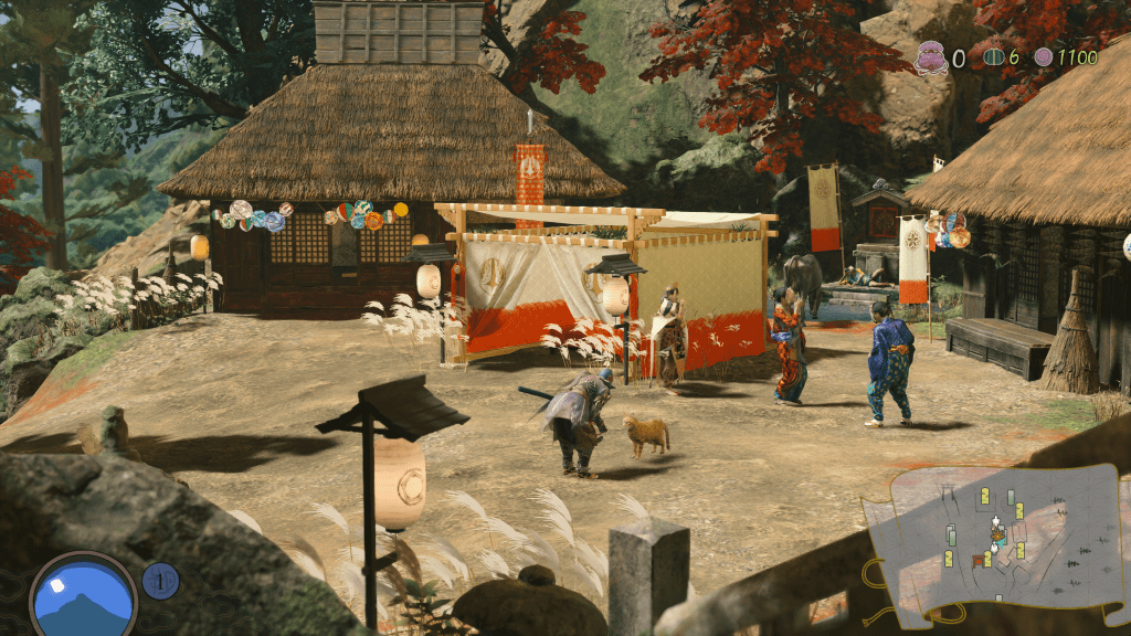 Speaking of vibes, let’s hop into the art. Like Shinsekai before it, the game portrays a beautiful natural world, under invasion by the metaphorical “other.” The forested mountain of Kunitsu-Gami contains a solid variety of environments, such as lakes and caves, but you’ll mostly spend your time in some combination of the many forest/village areas: first during the mission, when it’s overrun by corruption, and then during the day, where you work with the villages to recover and rebuild. Purifying the goop covering a level (plus the villagers and local wildlife) through combat, then rebuilding the town through all through your own actions strongly supports a central theme of recovery that runs beautifully through the whole game.