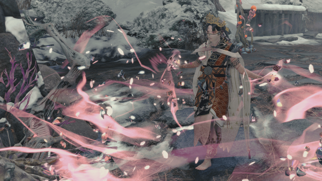 Acoustically, I have little to say. Music’s great, sound is great. Maybe the parry sound effect could be a smidge better, but all around 10/10 stuff. The most interesting thing here is the lovely, mostly silent world. The game does have voice acting, but it’s subdued and used sparingly. Yoshiro will wish you well when you leave her tent and cry out for help when she needs it, but by and large the game is purposefully designed around the absence of voice acting. Shinsekai, if I recall correctly, featured zero voice acting, so I consider this part of the director’s style at this point.