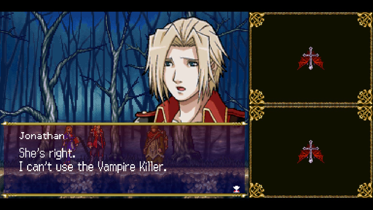I’ve mostly skipped over the story and narrative design up to this point, but I’d be remiss to not go over it because it does some rad stuff. While Charlotte is a perfectly capable witch and proud of it, Jonathan is… struggling. Bearing the Morris family name, he’s a descendant of the Belmont clan (you’re just going to have to trust me on this or look up a family tree), and thus he should be able to wield the legendary Vampire Killer whip. The legendary whip was left to Jonathan as his birthright but he bears a deep resentment towards his father for never teaching him how to tap into its power. Why wasn’t he taught this? Did his father deem him unworthy? Whatever the answer, Jonathan is tortured by his existence and inability to tap into the power that people assume he should have. From the very beginning of the game, you have the Vampire Killer in your inventory, but without the ability to utilize its power, it will languish there as one of the worst weapons in the game, and a symbol of Jonathan’s lifelong struggle. As the game goes on, Jonathan will learn various abilities that harken back to previous vampire slayers from a mysterious spirit that has taken residence in the castle, as he gradually finds his place in the world and learns more about his father.
