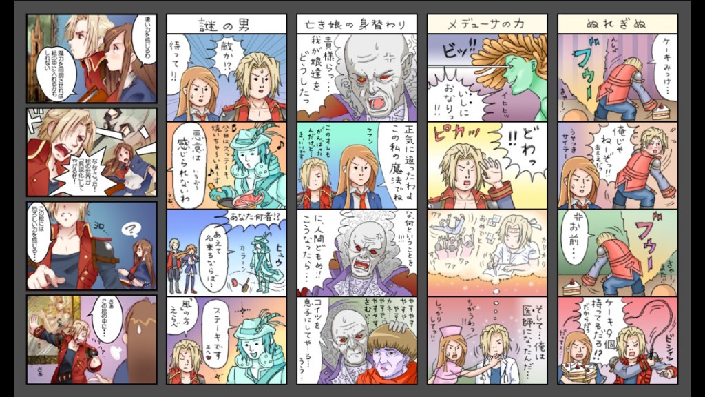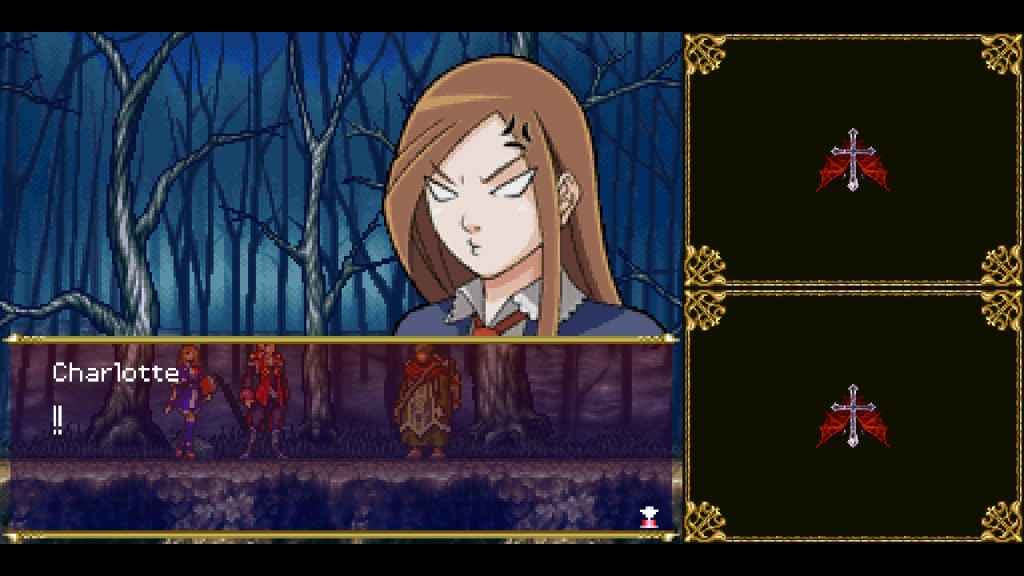 In what I assume to be a continued bid to combat declining series sales in Japan, Portrait of Ruin’s art direction follows Dawn of Sorrow’s choices with fairly generic anime art headlining the show. Though the cast have largely solid designs, the look of the whole thing is brought down somewhat by bland art direction, with character designs that feel almost as though they were simplified down for TV anime from some more intricate nonexistent original manga. That being said, where Dawn felt like it represented a significant downgrade from Aria in this regard, Portrait having an all new cast helps a lot. Soma looked a whole lot cooler in Aria than Dawn, but Jonathan having no previous iteration means plain anime art Jonathan still gets to be the coolest version of himself. Additionally, the team utilized the style more by including some 2000’s era anime reaction faces that really work in this game, even if they feel somewhat out of place in the larger canon of Castlevania. While the main story is still serious- wound surprisingly tightly around the narrative of 1994’s Castlevania: Bloodlines- the dialogue and character writing make Portrait the most intentionally humorous and otherwise silly “mainline” Castlevania game. It’s an interesting choice, but it does legitimately help differentiate it without spoiling the occasion.
