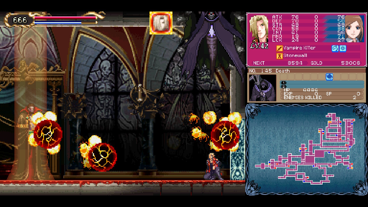 Jonathan’s growth as a character and his eventual mastery of the Vampire Killer really works on multiple levels, and in my opinion it really elevates the game’s story by combining a satisfying narrative build up with a satisfying gameplay build up. The Vampire Killer sequence being optional and almost certainly requiring the player returning later really sticks with you as something you feel compelled to get done, and it’s gratifying to land its Holy element attacks against the vampires (and worse?) that you’ll face through the game’s great finale. Speaking of which, man, what a last boss. Jonathan and Charlotte squaring up against a tag-team of Death and Dracula is just awesome. Both bosses come with the standard kit they have in other Castlevanias, but the difficulty is elevated dramatically by having to deal with both at once. With some new tricks in tow, you’ll find that they put up a surprisingly challenging fight, and it’s super rewarding to overcome.