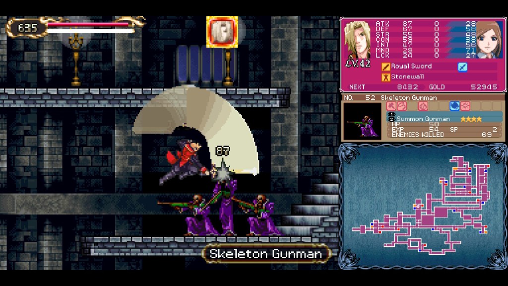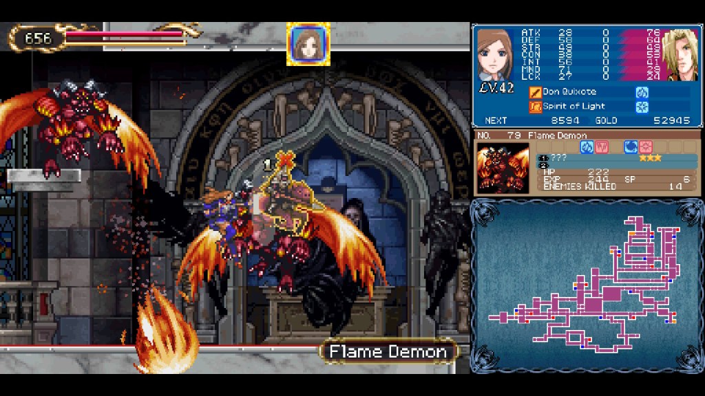 The setting for the journey is largely Dracula’s Castle, which serves as the main hub and a sizable map itself. Similar to Super Mario 64, the castle is filled with portraits which will whisk you away to separate maps in faraway lands like London and Egypt, allowing for a really wide breadth of environmental art which they capitalize on well. If I’m remembering correctly, this is the first Igarashi directed Castlevania that breaks things up into such clearly sectioned off “levels” in this way, and I think it really works well in this game! They never feel quite as open as previous games in the series, but they’re not yet as uncompromisingly linear as Order of Ecclesia. One really nice narrative design element is that the game’s initial antagonist, Brauner, has painted the portraits himself! This artistic side of his recurs when you eventually face him in combat, and it adds a nice little aesthetic wrinkle to him when many Castlevania antagonists are very one note. Brauner triples up as a vampire, a painter, and a single father, and that’s a lot more than you can say for Dracula!