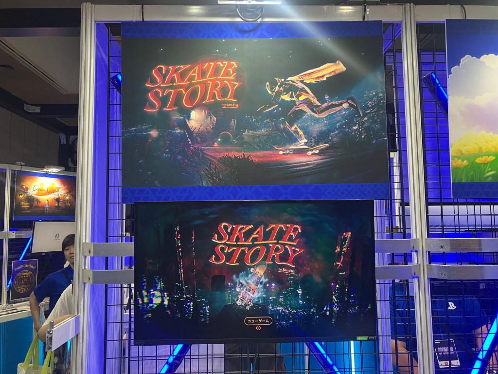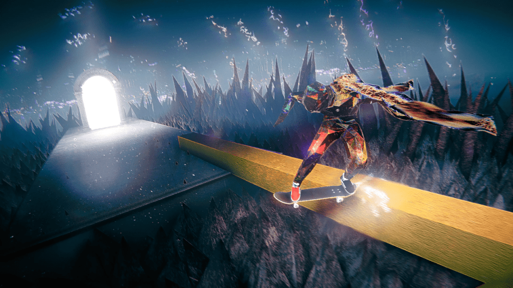 Skate Story is an intensely moody game. The music is loud, sound effects are impactful, and the world is both strikingly beautiful and horribly abrasive. Though I can’t deny the unbeatable gameplay purity of free roam exploration and score seeking in Tony Hawk’s Pro Skater titles, Skate Story provides a completely alternate but similarly compelling take on how skateboard games could be. Stages in the demo consisted mostly of short, sub one minute dashes through an environment, which would quickly segue into the next with no menu or downtime in between. A crash or wipeout sees your character explosively shatter into shards as the camera topples to the ground, momentum intact, all without stopping the music. Despite the game seemingly having no real stakes in the section I played, the mood really makes for a pulse-pounding experience right from the get-go.