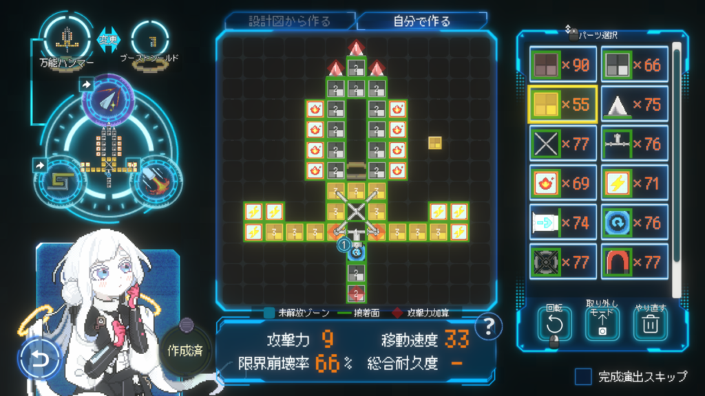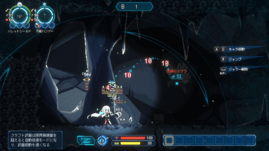Levels in Million Depth are simple 2D combat arenas where you and your enemies side-scroll at each other to engage in combat. By bumping into your foes, you’ll inflict damage to them, whereas enemies signal their attacks with glowing AoE effects that include the incoming damage value, allowing you to calculate how you want to deal with it (jump over it, take the hit, move away?) Adding to this is a fun tool/weapon pod that you control with the mouse, independently from your character. Using a simple grid-based visual editor, the user can customize their mouse controlled tool to their liking and use it in addition to Moma to engage with enemies.